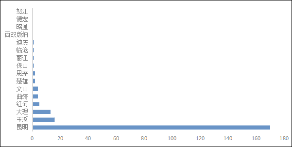 云南省下轄8個地級市、8個自治州,合計16個地級行政區(qū)劃單元,省會昆明市。本次調查的云南省環(huán)保企業(yè)數(shù)量的地區(qū)分布如圖6。