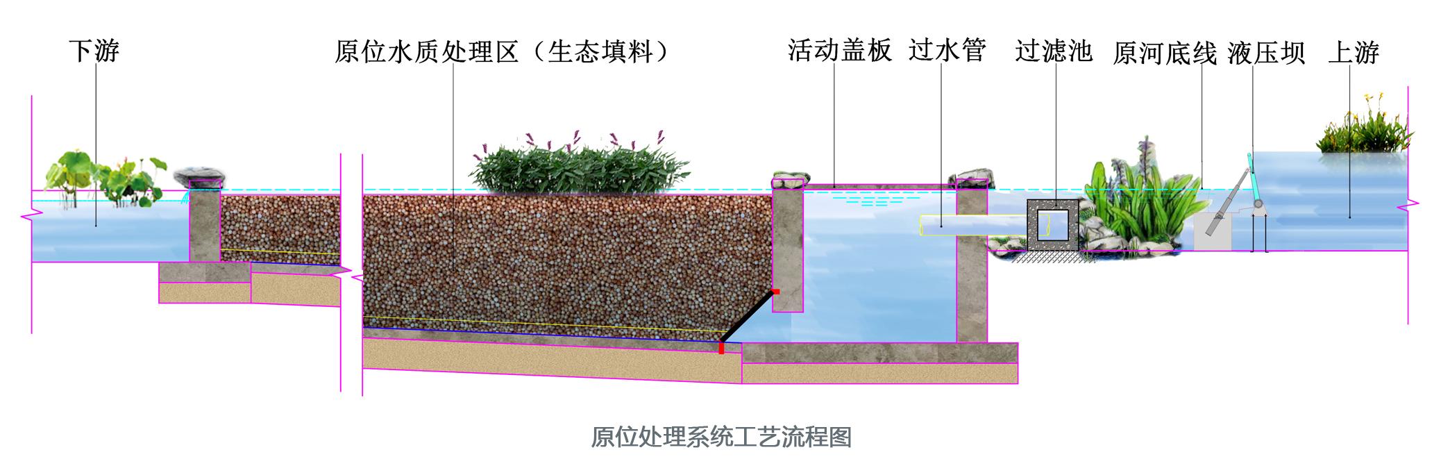 主要利用河道的河床,在河床下建設(shè)處理單元。在不降低行洪標(biāo)準(zhǔn)的前提下,通過(guò)自動(dòng)控制的壩體調(diào)整河道水位高差,將污染水引入水下處理單元,采用具有針對(duì)性的脫氮除磷強(qiáng)化填料做基質(zhì),對(duì)水質(zhì)進(jìn)行凈化。用于周邊土地資源緊張的城市河道治理。